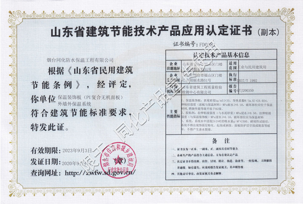 近日,煙臺同化防水保溫工程有限公司迎來喜訊,2020年09月,根據《山東省民用建筑節能條例》,經評定,公司保溫裝飾板(PU復合無機面板)外墻外墻保溫系統符合建筑節能標準要求,特發此證。